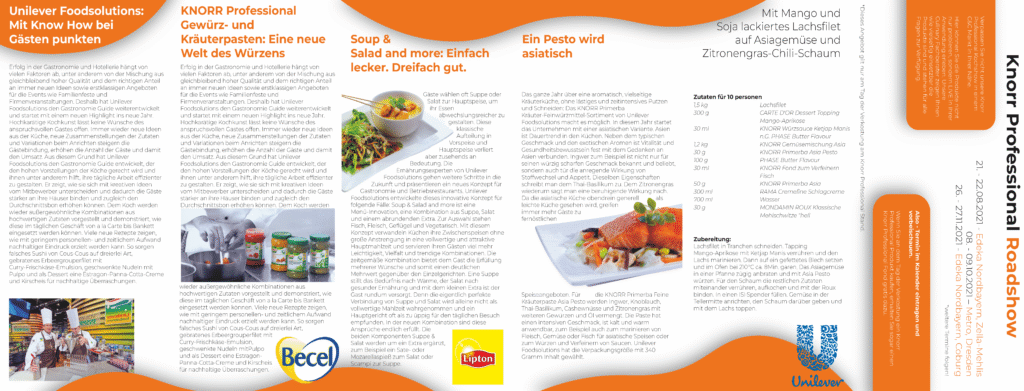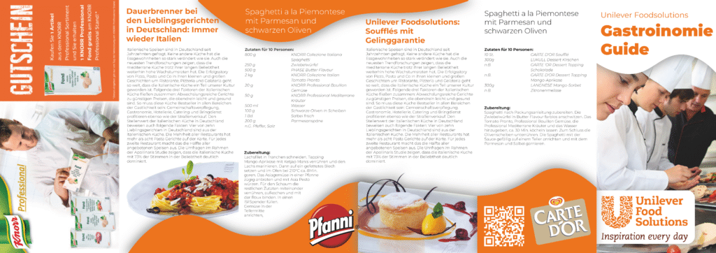 Im Projekt „Entwicklung und Herstellung eines Werbe-Faltblattes“ bestand die Aufgabe darin, für die Firma Unilever Food Solutions (UFS) ein 12-seitiges DIN-lang-Faltblatt zu gestalten, das auf der Messe Internorga in Hamburg verteilt und anschließend per Post versendet werden kann. Ziel war es, Messebesucher im Nachgang zu informieren, zu aktivieren und zum Kauf zu bewegen. Dafür wurden zunächst drei verschiedene Zielgruppen definiert und beschrieben. Anschließend wurde ein Layout-Handout erstellt, das die inhaltliche Seitenplanung, Gestaltungsidee, das Raster sowie alle gestalterischen und technischen Angaben wie Schriftarten, Größen, Zeilenabstände, Satzarten und Maße enthielt.